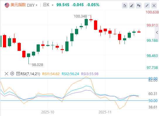 美元在美国政府停摆结束后出现普遍走弱。此前特朗普签署发令,使邦雇员将陆续复工,随后的较短时间内,市场整体交投平静,但欧盘时段美元走低。美元指数的回落走势正在推动行情跌破此前的上行趋势,目前的图表结构已经稍显羸弱。债券多数走软,美国股指期货表现不一、略偏下行。这显然不是对政府重启的正面反应,可能反映投资者对即将重新发布的美国经济数据基调感到担忧。9月非农数据将在本周四公布,而11月非农预计将在12月的美联储决议前公布,10月的数据可能被完全跳过。目前的美元指数走弱表明押注疲弱的数据将强化进一步降息的前景。然而,美联储官员近期的讲话显示,对12月的政策决定内部存在显着分歧,这削弱了市场对美国降息路径的信心。利率掉期定价也反映出市场对今年最后一次议息会议结果的不确定性,目前降息的概率约为五五开。不过,我们目前对美元指数倾向下行的核心观点保持不变。