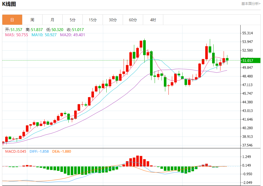 现货白银:截止北京时间21:20,现货白银下跌,现报51.019,跌幅0.62%。纽市盘前,(白银)价格在最后一个交易日下跌,在达到超买水平后,相对强度指标出现负面信号,超过了其EMA50的支撑,这使其处于负面压力下,阻碍了未来一段时间的复苏尝试,主要看涨趋势占主导地位,其交易伴随着该趋势的支撑性次要趋势线。