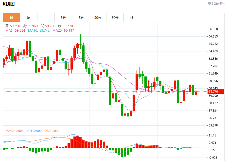 原油市场:截止北京时间21:20,美油上涨,现报59.770,涨幅0.88%。纽市盘前,(原油)价格在最后一个交易日上涨,受到相对强度指标出现积极信号的支持,在达到超卖水平后,触及其EMA50的阻力,受到短期负面技术形态(上升楔形形态)的影响,减少了短期复苏的机会。