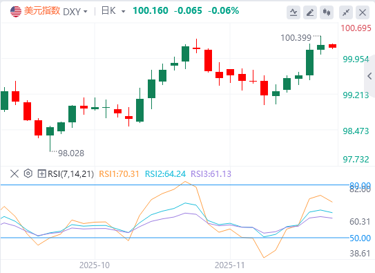11月21日,北京时间周五亚市早盘,美元指数徘徊在100.16附近。周四,由于喜忧参半的非农就业数据未打消市场对美联储12月降息的质疑,美元指数维持在100关口上方高位震荡,盘中触及6个月高位,最终收涨0.105%,报100.23;美债收益率有所回落,基准的10年期美债收益最终收报4.088%,对美联储政策利率敏感的2年期美债收益率收报3.545%。现货黄金区间震荡,美盘再度触及4100美元/盎司,但随后回落,最终微涨0.01%,报4078.59美元/盎司;现货白银最终收跌1.43%,报50.63美元/盎司。由于泽连斯基表明对和谈的开放态度,国际原油延续跌势。WTI原油美盘持续下挫,最终收跌1.2%,报58.69美元/桶;布伦特原油最终收跌0.92%,报62.67美元/桶。