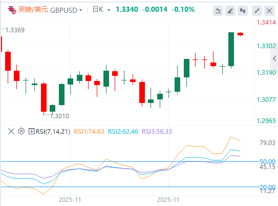 英镑:截至发稿,英镑/美元徘徊在1.3340附近。本周发布的一组美国经济指标表现不一,几乎没有改变美联储(Fed)在12月政策会议上再次降低借贷成本的预期。技术面上,如果英镑兑美元成功突破1.3375关口,将朝下一个阻力位1.3475–1.3490方向前进。需要注意的是,RSI处于超买区间,因此回调风险正在增加。