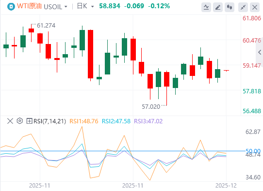 技术面:日线图上WTI继续跌破下行趋势线,表明空头依然掌控局势。21日简单移动平均线(SMA)作为直接阻力,与下降趋势线约59.50美元相符。若明显突破该区域,将暴露下一个阻力区,60.50-62.00美元区间将由100日均线强化。需要在该区域上方果断上涨,以缓解更广泛的空头压力。下行方面,初步支撑位于58.00美元附近,随后是11月低点57.00美元左右,跌破该低点可能带来更深的跌幅。动能指标在短期内呈现出复杂但略显建设性的局面。移动平均收敛背离(MACD)略高于信号线,接近零点,并呈现一个适度的正直方图,显示看跌压力正在减弱。相对强弱指数(RSI)约为48,反映中性动能,向50中线移动。与此同时,平均方向指数(ADX)为12.7,凸显了缺乏强劲趋势。
