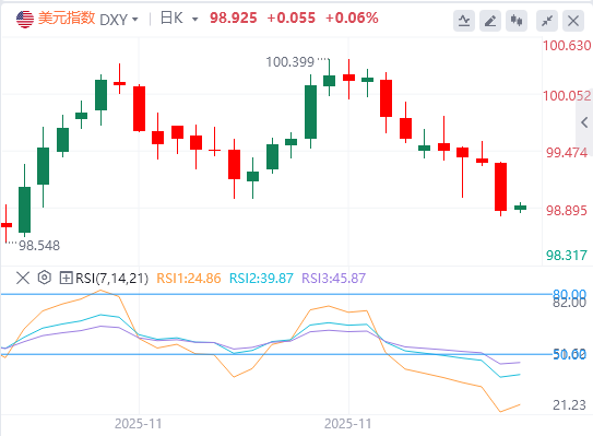 12月4日,北京时间周四亚市早盘,美元指数徘徊在98.92附近。周三,美元指数延续跌势,在ADP就业报告显示美国11月就业岗位意外下降后,美元扩大跌幅,最终收跌0.45%,报98.88;基准的10年期美债收益率最终收报4.0670%,对美联储政策利率敏感的2年期美债收益率收报3.4980%。ADP数据意外下跌,增强了美国下周降息的预期,但现货黄金在触及4240美元后回落,最终收跌0.08%,报4202.42美元/盎司;现货白银创下历史新高的58.98美元后回落,最终收涨0.04%,报58.47美元/盎司。投资者认为俄乌和谈不太可能导致俄罗斯原油相关制裁取消,国际油价上涨,扭转了早些时候的跌势。WTI原油最终收涨0.84%,报59.12美元/桶;布伦特原油最终收涨0.64%,报62.78美元/桶。