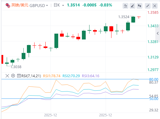 英镑:截至发稿,英镑/美元徘徊在1.3514附近。英受全球美元流动普遍减少支撑。随着我们接近因假期缩短而关闭的一周中点,投资者情绪积极,美元受到美联储(Fed)预计在2026年进一步放宽政策的压力。技术面上,英镑/美元已达到1.35关口,如果能突破1.3450,会触及该区间,而这一关口已经非常迅速。