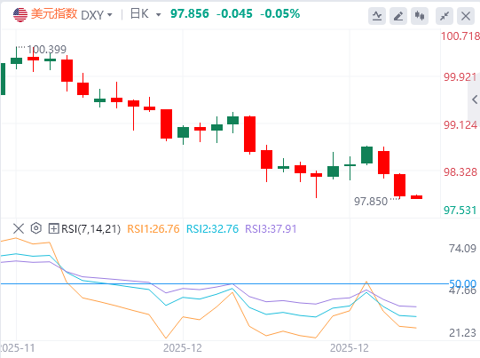 美元指数:截至发稿,美元徘徊在97.85附近。周二,美元在假期缩短的交易中走弱,尽管经济数据强于预期,但对明年美联储进一步降息的预期继续抑制市场情绪。美国第三季度国内生产总值(GDP)意外增长4.3%的年化增速并未导致美元对英镑(GBP)的反弹,英镑兑美元升至12周高点。然而,市场普遍认为美联储将在1月份维持其立场,然后在年内恢复降息,期货显示2026年将有两次降息。技术面上,下跌短暂击破了上周的97.869低点,随后在斐波那契支撑位97.814前停滞。守住该水平将使短期多头保持竞争力。当前阻力位于98.307;若跌破该点,将打开通往98.591及近期98.749高点的大门。