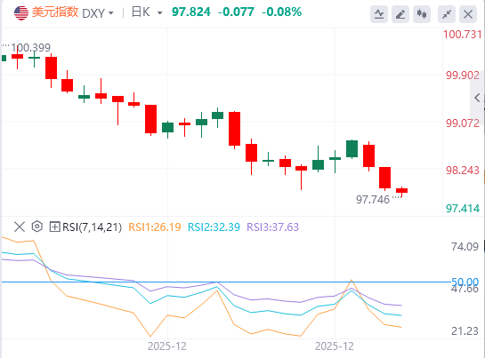 周二,尽管数据显示全球最大经济体增长强劲,但未能改变市场对美联储明年将降息的押注。美元指数日内持续下行,并跌破98关口,截至目前,美元报价97.82。