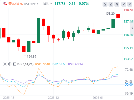 美元兑日元在欧洲早盘回升158.00,此前亚洲时段经历了轻微波动。日元因政治紧张局势再度加剧而走弱,风险避开的市场环境对缓解压力帮助甚微。日中贸易裂痕加深,并有报道称日本首相高市早苗可能提前举行大选,这在对下一次日本央行加息可能时间的不明朗中增加了不确定性”,使本币持续被压制。