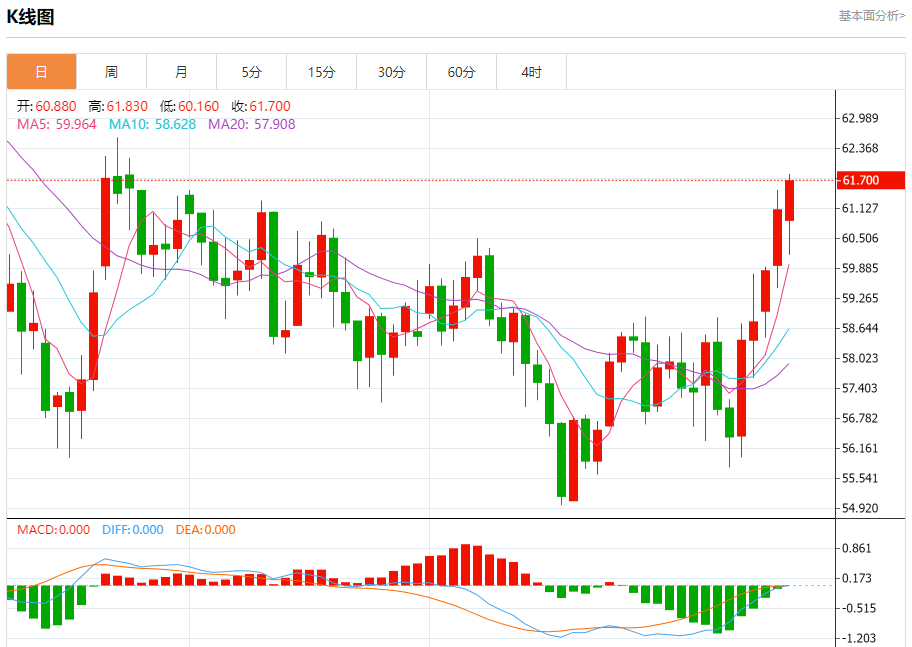 原油市场:截止北京时间21:20,美油上涨,现报61.690,涨幅1.25%。纽市盘前,(原油)价格在最后一个交易日强劲上涨,突破了61.00美元的阻力,在短期内主要看涨趋势占主导地位,表明了这一轨道的强度和主导地位,注意到相对强度指标的积极信号的出现,在卸载其超买条件后,为实现最后的上涨开辟了道路。
