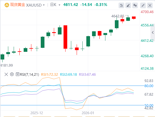 技术面:黄金价格上涨趋势依然完好,金价创下4643美元/盎司的历史新高。一旦买家突破4650美元/盎司,金价有望进一步上涨,并向4700美元/盎司发起冲击。然而,相对强弱指数(RSI)显示,多头似乎正在失去一些动力,目前RSI在超买区域附近保持平稳。如果金价跌破4600美元/盎司,交易者可能会关注回调,初步目标位在4550美元/盎司。下一个关键支撑位是4500美元/盎司。
