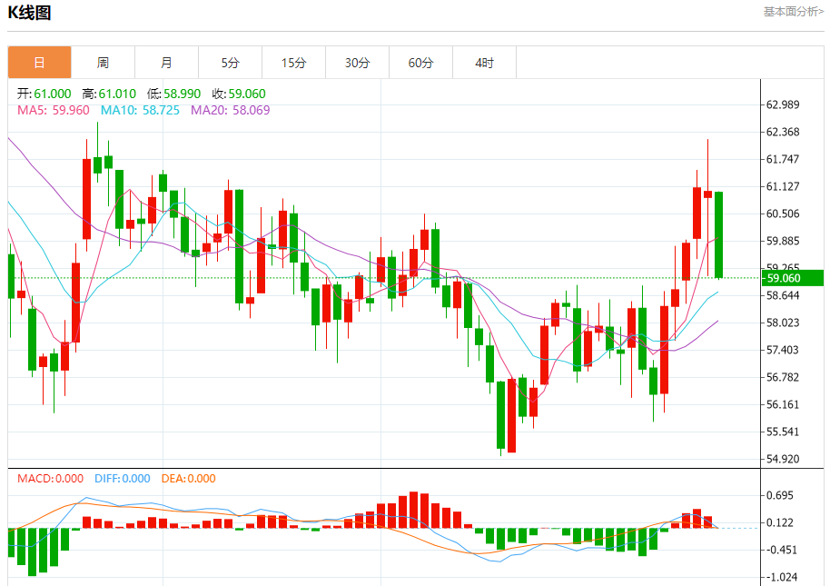 原油市场:截止北京时间21:20,美油下跌,现报59.050,跌幅4.56%。纽市盘前,(原油)价格在最近一个交易日继续大幅下跌,因为相对强势指标出现了负面信号,试图寻找上涨低点,以此作为基础,可能有助于其获得复苏所需的看涨动力,同时继续在EMA50上方交易所代表的动态支撑,如果保持目前的支撑,则加强了价格在近期基础上复苏的机会。