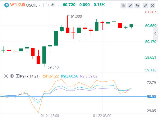 技术面:WTI原油相对弱势,维持在60-61美元区间震荡,5日均线提供短期支撑,但若无法突破61.2美元关键阻力,可能再度回踩60美元整数关口。