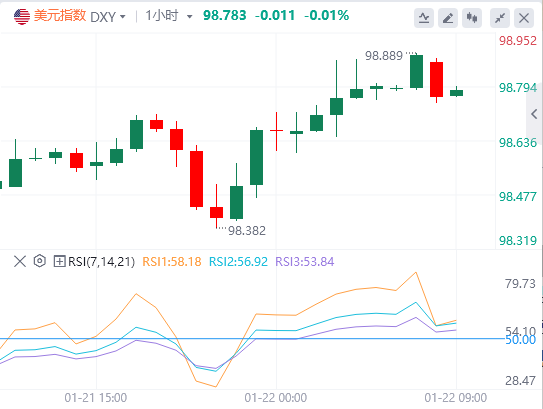 1月22日,北京时间周四亚市早盘,美元指数徘徊在98.78附近。周三,特朗普称已就格陵兰岛问题形成了未来协议的框架,不会征收原定于2月1日生效的关税,美元指数突破横盘走势,最终收涨0.23%,报98.77;基准的10年期美债收益率最终收报4.245%,对美联储政策利率敏感的2年期美债收益率收报3.597%。现货黄金延续周二涨势,但因特朗普透露格陵兰岛问题似乎迎来转机,黄金涨幅收窄,最终收涨1.38%,报4828.90美元/盎司;现货白银由涨转跌,最终收跌1.57%,报93.09美元/盎司。消息称,哈萨克斯坦两个油田将再暂停生产七至十天,国际油价因供应趋紧上涨。WTI原油最终收涨1.98%,报60.81美元/桶;布伦特原油最终收涨2.16%,报65.37美元/桶。