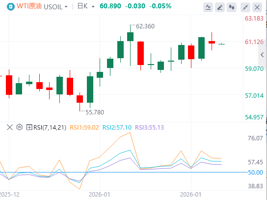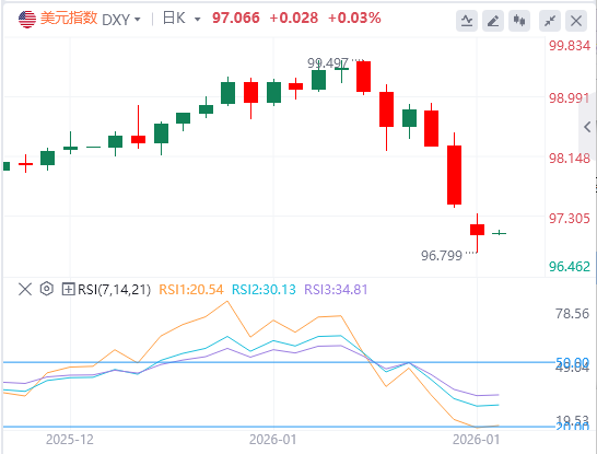 1月27日,北京时间周二亚市早盘,美元指数徘徊在97.06附近周一,美元在兑一篮子货币汇率跌至四个月低点后持续疲软,而日元则因市场对美日联合干预汇市的猜测大幅上涨。美元指数最终收跌0.436%,报97.04;基准的10年期美债收益率走低,最终收报4.2180%,对美联储政策利率敏感的2年期美债收益率收报3.598%。由于美元疲软增强了需求,贵金属价格再创新高,但随后剧烈波动回落。现货黄金盘中突破5100美元/盎司,美盘午后震荡走低跌破5000美元关口,最终收涨0.45%,报5008.55美元/盎司;现货白银盘中冲上117/盎司,日内一度暴涨14%,创全球金融危机以来最大盘中涨幅,随后自高位大幅回落,抹去日内所有涨幅转跌,最终收涨0.4%,报103.625美元/盎司。现货铂金下破2600美元/盎司,早前创下新高至2919美元/盎司,收跌7.23%,报2570.20美元/盎司。由于欧佩克+成员国哈萨克斯坦供应前景改善,掩盖了人们对冬季风暴带来的降雪和冰冻天气袭击美国大片地区将抑制产量的担忧,油价小幅下跌。WTI原油收跌0.78%,报60.92美元/桶;布伦特原油收跌0.69%,报64.84美元/桶。由于美国全国多地遭遇严寒天气,供暖需求激增,同时供应也出现中断,美国天然气价格突破7美元/百万英热,为2022年以来首次,较上周五收盘价上涨了40%,寒冷地区价格突破200美元/百万英热。