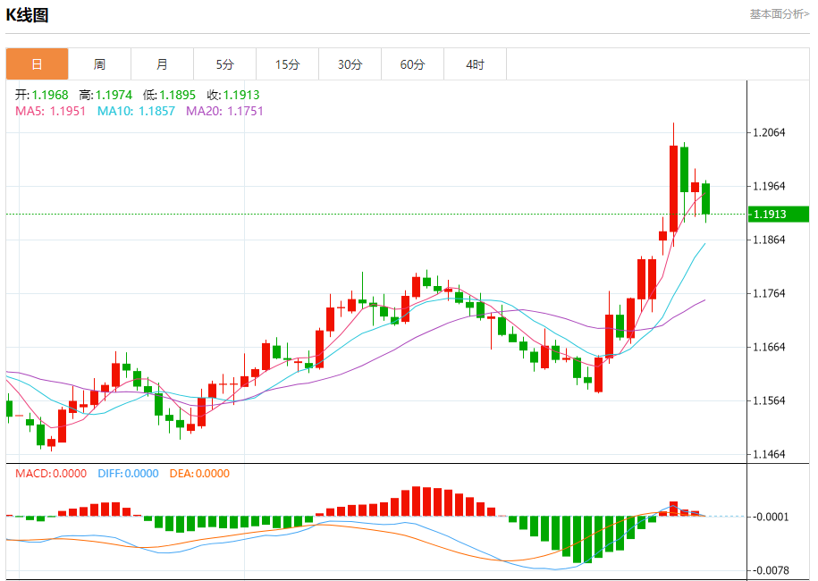 欧元/美元:截止北京时间21:20,欧元/美元下跌,现报1.1915,跌幅0.47%。纽市盘前,由于1.1900支撑的稳定性,欧元兑美元的价格在最后一个交易日上涨,在短期主要看涨趋势占主导地位的情况下,获得了有助于实现这些收益的看涨势头,其在EMA50上方的交易所代表的动态支撑继续存在,增强了近期扩大收益的机会。
