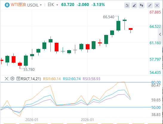 技术面:WTI原油日线图显示,布林带(26,2)中轨位于59.72美元,上轨位于64.67美元,周五收盘价已稳定运行于布林带上轨附近,显示短期强势特征明显。50日移动平均线(MA50)位于58.98美元,为油价提供了坚实的技术支撑。MACD指标(26,12,9)显示,DIFF值为1.55,DEA值为0.90,MACD柱状图为1.32,均处于零轴上方且呈发散状态,表明多头动能持续增强。