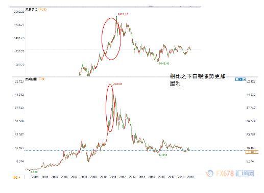 由于当前金银比处于极高的水平,因此未来将会出现两种情形,一种是金价走低,银价走高,另一种是两者同步上涨,但是银价走势明显强于金价,这种情况在1980和2010年都成出现过,当时黄金飙升,但白银却出现了近乎垂直上涨般的行情。