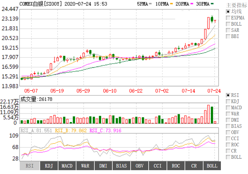 白银需要突破阻力区间23-23.25美元才能继续上行趋势。在这种情况下,白银将冲向下一个阻力位24.50美元。然而从整体来看,白银刚刚出现了重大反弹,大幅回调的风险很高,白银的最近支撑位位于21.15美元。国际银价在本周连续上涨突破了2016年高点21.23美元/盎司后,迎来一波回调,跌幅高达1.54%至22.621美元/盎司。中美局势仍然是投资者日内关注的焦点,美国此前要求关闭中国驻休斯敦总领馆,需要警惕中国今日宣布对美国反制措施,若果真如此,市场避险情绪势必会迅速升温,从而刺激银价进一步上涨。