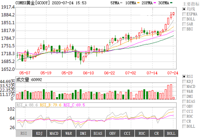 北京时间7月23日欧盘时段,现货黄金上破1880美元/盎司,为2011年9月以来首次,后涨幅扩大至0.8%,最高涨至1888.57美元/盎司。COMEX期金、期银涨超1%。美盘时段,现货黄金上破1890美元/盎司,再创九年新高,日内涨超1%,最高涨至1898.25美元/盎司,较日低拉升近30美元。COMEX期金突破1890美元/盎司,续刷2011年9月以来新高;现货白银日内转涨。