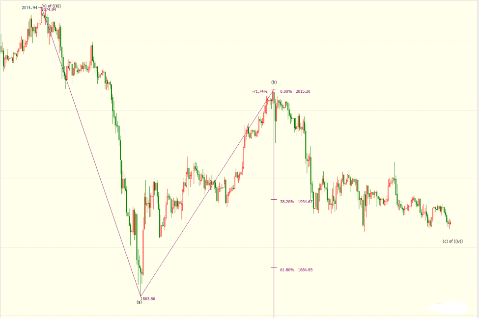 小时图上看,金价处于自2015美元开启的下行?浪中,跌至?浪50%目标位1910美元附近,下一道支撑位看向61.8%目标位1885美元。?浪是自2075美元开启的调整((iv))浪的子浪。