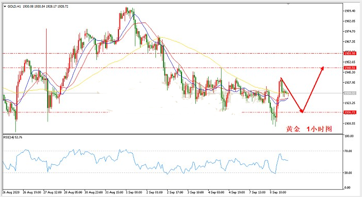 如上图1小时所示,趋势上,黄金震荡偏涨,修复前期1948的可能性极大,操作上逢低买入为主。 在黄金1小时周期中,上周五已经改变其下跌趋势,昨日晚间的反弹也改变从1948为起点的诱空趋势,预计今日小幅下跌回撤后金价将展开一波上涨,预期今明两日将上涨至1948-1958区间。