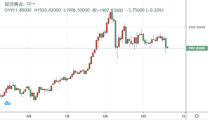 周二(9月22日)亚市盘中,现货黄金徘徊于日低点上方,现报1908美元/盎司。与此同时,现货白银窄区间内震荡,报24.56美元/盎司。美元指数基本持稳,现报93.56附近。此前交易日,现货黄金收报1912.23美元/盎司,下跌37.49美元或1.92%,盘中触及8月12日以来的最低水平1882.60美元/盎司,跌幅达3.4%,盘中最高触及1955.40美元/盎司;现货白银下跌8%,至24.69美元/盎司,盘中触及一个多月来的最低水平23.68美元/盎司,盘中跌幅达10%;美元指数收报93.53,上涨0.56%,盘中最高触及93.78,最低触及92.75。