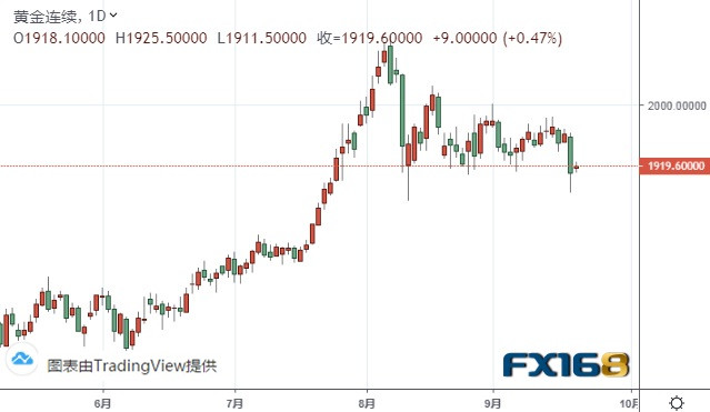 因美国更多财政刺激措施的不确定性导致更广泛的市场抛售,再加上美元走强,周一黄金价格大跌。COMEX 12月黄金期货收跌2.6%,报1910.60美元/盎司,创7月份以来收盘新低。