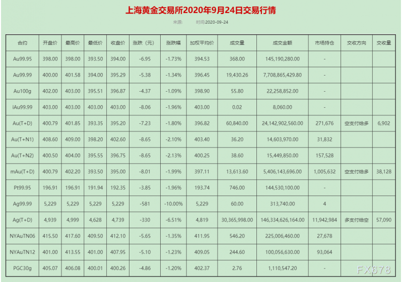 上海黄金交易所2020年9月24日交易行情