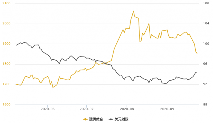周四(9月24日)黄金T+D收盘下跌1.80%至395.2元/克,创逾三个月新低;白银T+D收盘下跌6.51%。现货黄金跌破1850大关,创7月22日以来的两个月新低,日内美元指数进一步走高,创两个月新高至94.5593,避险独青睐美元,全球股市继续承压,黄金避险需求全无。分析师们认为,黄亚汇资者应该关注这五点,1、美元表现;2、利率低位运行;3、关键技术位;4、黄金ETF持仓;5、美国大选不确定性。