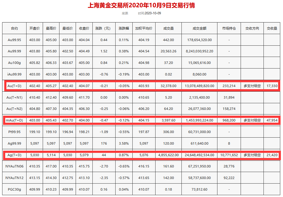 上海黄金交易所2020年10月9日交易行情