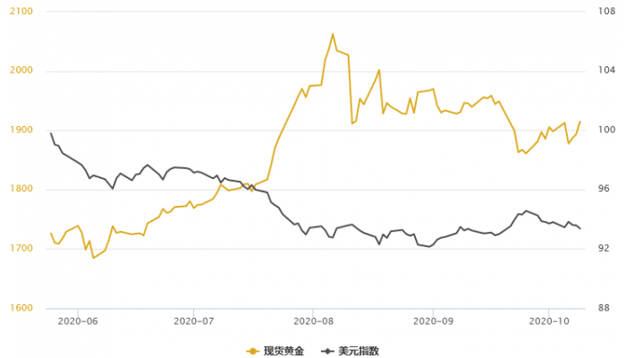周五(10月9日)现货黄金大幅走高逾20美元至1916美元/盎司附近,美元指数跌跌不休,创近三周新低至93.3276,美国已经重启刺激计划谈判,同时在美国大选来临之际,黄亚汇资需求继续上升。