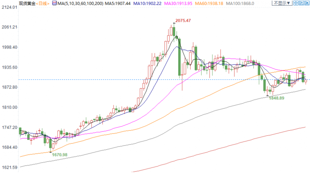 金价维持在1900美元/盎司附近区域波动,表明了其波动性会继续,回升到2000美元/盎司的情况会比预期得更晚出现。