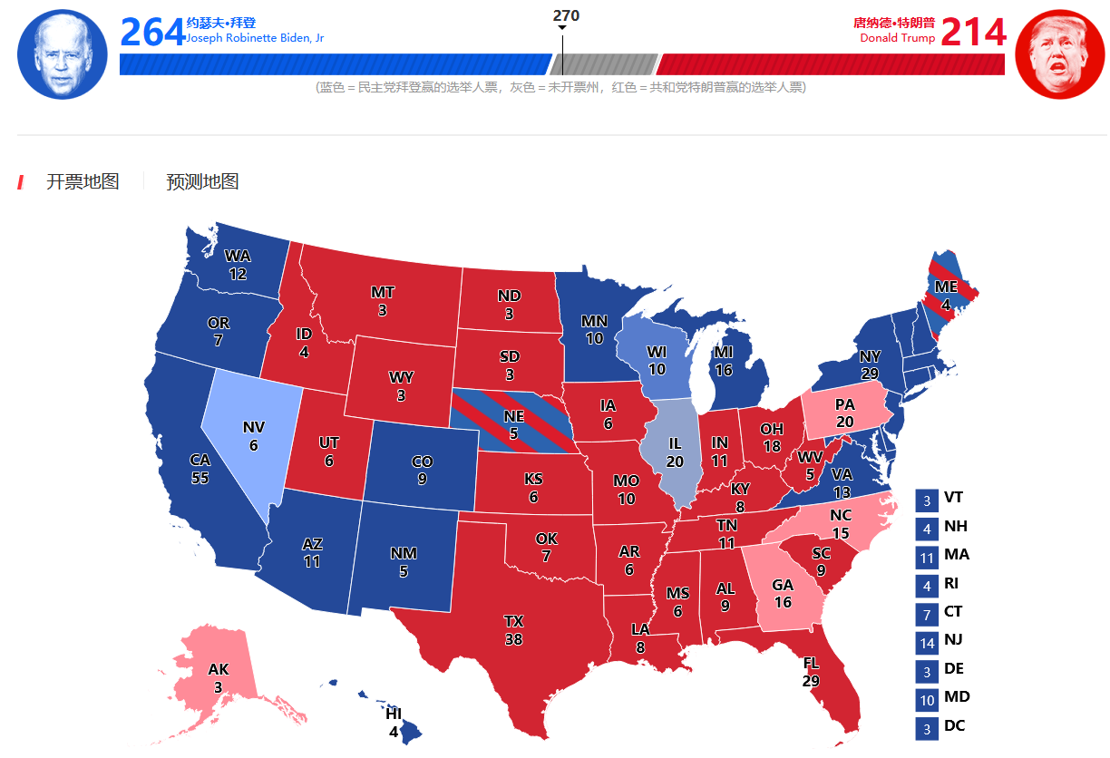 据美联社和福克斯新闻等美国媒体统计,目前特朗普已获得214张选举人票,拜登获得264张。首先获得538张选举人票中270张的候选人将赢得大选。截至目前,还有阿拉斯加州、佐治亚州、内华达州、北卡罗来纳州、宾夕法尼亚州等5个州还未出结果。