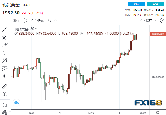 美市盘中,现货金上涨逾1.5%,刷新日高至1933.24美元,较日低高出逾30美元。COMEX期金日内大涨2.01%,现报1934.5美元/盎司。
