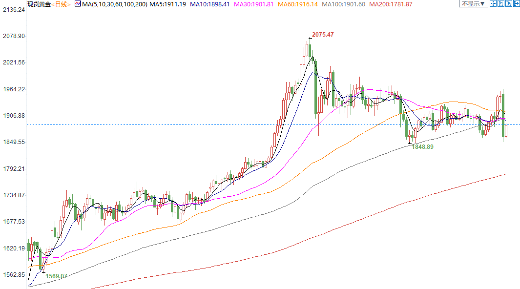 Bhar表示,接下去这24个小时对黄金来说是很关键的,市场要关注金价能否维持住关键的支撑水平。目前金价维持住了9月低位1850美元/盎司左右水平,接下去关键的就是200日移动均线1794美元/盎司。