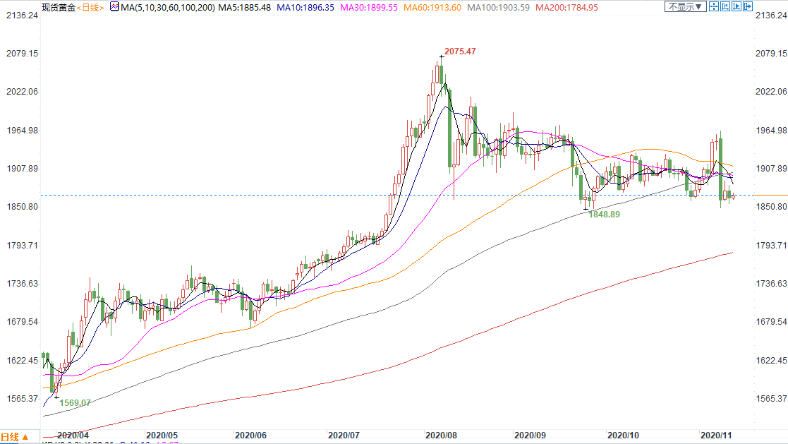 本周一则疫苗的消息令整个市场震动,黄金遭遇了巨大打击,跌至1870美元/盎司下方。
