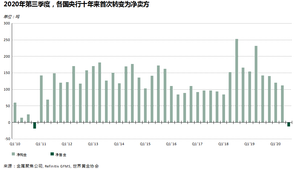 今年三季度各国央行净抛售黄金,这是近10年以来的第一次。随着今年接近尾声,各国央行购金速度变缓,同时伴随着第三季度售金量的有所增加。