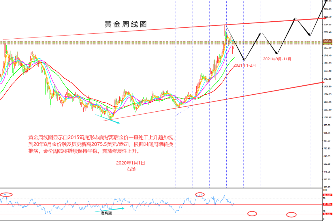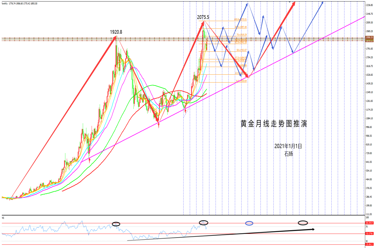 从月线级别的2020年8月筑顶RSI指标超80数值显示超买回撤信号出现后,金价连续4个月收阴,但是根据历史金价走势中RSI指标超过80以上之后次月开始大跌的3次走势来看,目前的金价这个震荡下行回撤时间还不够。2011年8月月线图RSI超过80形成超买后,金价振荡13个月未能突破前高,下调调整3年之久。所以根据目前基本面市场数据及美元走势对金价的影响来看,目前并不支持见顶,因为RSI指标月线图根本不存在顶部形态RSI指标的背离出现,根据时间周期转换历史行情数据计算等手段,金价想突破前期8月高点2075.5美元,那么需要关注本年度2021年的第三季度的8月,重点关注是第四季度的11月后。月线级别的回撤调整目标根据多重技术数据综合分析21年金价回档目标首要关注理论调整目标1763/1684,极限回调位1613/1560。时间周期自2011年9月金价上涨触及1921美元,创历史高点后至2015年12月金价下调跌至1046美元,经历52个月时间周期,那么本轮金价上涨是2020年3月,所以21年预期3月也依旧较为为重,决定了金价未来下半年2-4季度的走势,如果确立2075.5顶部形态成立,那么金价未来的调整周期时间在2025年的6/8月结束。