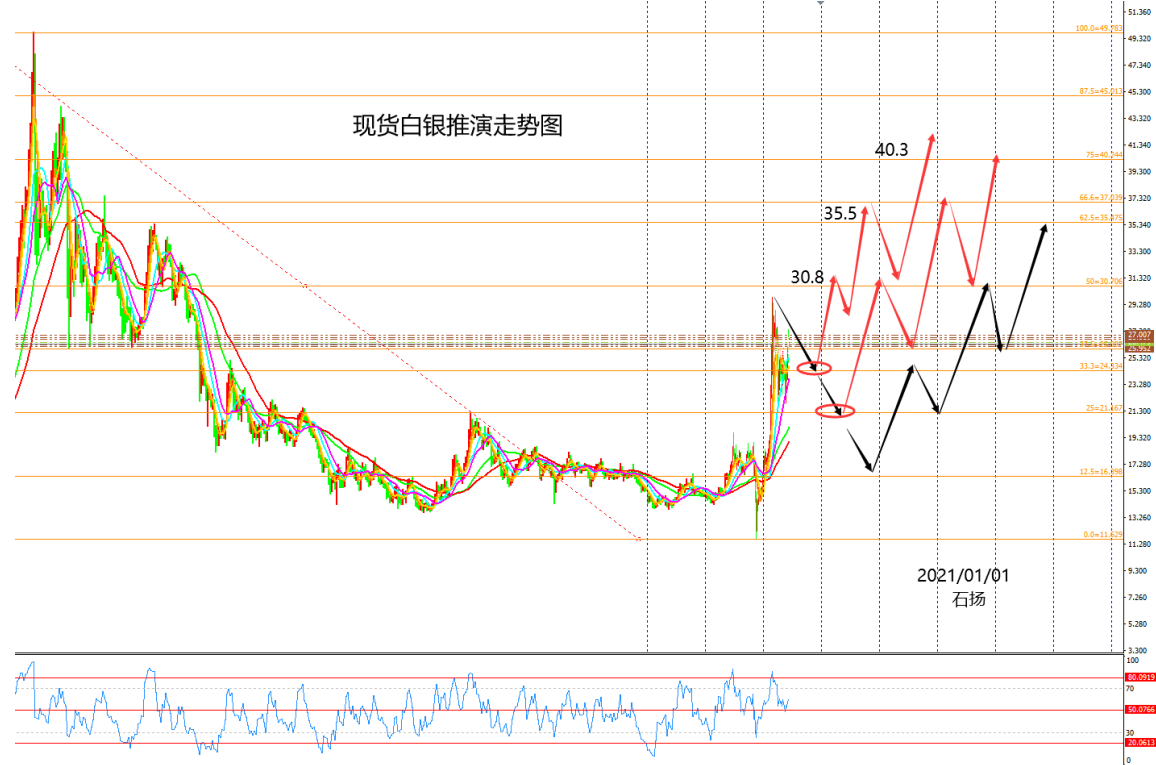 现货白银2020年3月份的大抛售,白银一度从18.9美元跌至2011年低点11.6美元,跌幅达到34%。但此后白银受到市场基本面数据疫情及美国财政刺激加上工业的需求,白银经历短期的大幅调整下跌后开始步入正轨,从3月份低点11.6美元报价一鼓作气飙升至8月份的29.85高点,年度上涨接近45%。如同黄金一样,白银在2020年的大涨得益于白银ETF的疯狂买入,根据全球最大的白银ETF的持仓报告,2020年SLV的持仓量飙升了1.948亿盎司,约合5522吨。不过我们需要注意的一点,黄金和白银属性基本相同都是贵金属投资和商品,而黄金已经创出历史新高2075.5美元高点,而白银实际走势只是2011年高点以来的48%附近,对于未来基本面的利好及数据影响利好下,白银未来的上升空间更加具有想象空间。技术上看白银周线图,在技术性上远远优于黄金,白银在6月末MA10均线金叉MA30均线之后,回撤调整后MA10均线目前仍处于MA30均线上方运行,则有望走出单边的上升趋势多头行情。白银技术面上行阻力多头关注黄金分割率0.875位置28.81/3季度形成慢牛则有望21年度形成单边多头主力我们将看向30.8/35.5/40.3等依次高点。