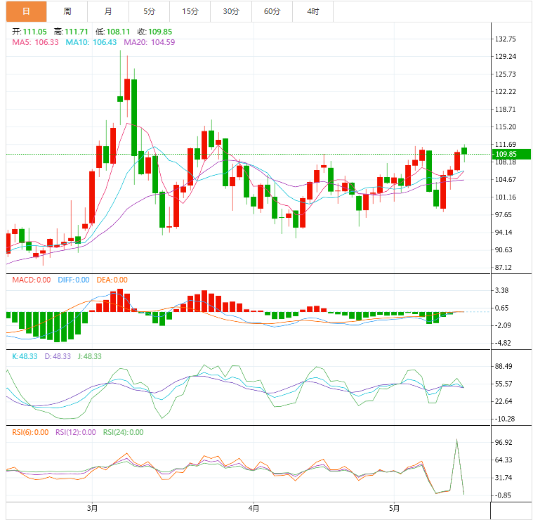 美原油上行受阻,目前交投于106.84美元/桶,尽管国际能源署(IEA)强调了全球燃料库存的紧张局面,而且市场继续受到欧盟对俄罗斯石油禁运导致供应紧张的前景影响,油价近几个交易日震荡走高,但OPEC也第二个月下调2022年全球石油需求增长预测,欧盟也开始考虑推迟制裁俄罗斯石油,亚洲新冠疫情打压需求前景,油价涨幅也受到限制。短线油价偏向震荡运行。