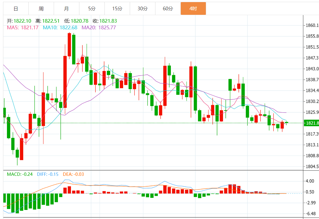 从4小时图来看,由于金价跌破长达两周的对称三角形,加之相对强弱指数(RSI)下降且MACD传递看跌信号,黄金空头仍然抱有希望。此外,因金价成功跌破5月16日至6月12日升势的61.8%斐波那契回撤位,这进一步加剧黄金的看空倾向。黄金空头首先瞄准1805美元/盎司附近的78.6%斐波那契回撤位,若跌破该位,金价可能下探1800美元/盎司关口。一旦金价失守1800美元/盎司,金价可能进一步下滑,并跌向5月触及的年度低点(1786美元/盎司左右)。
