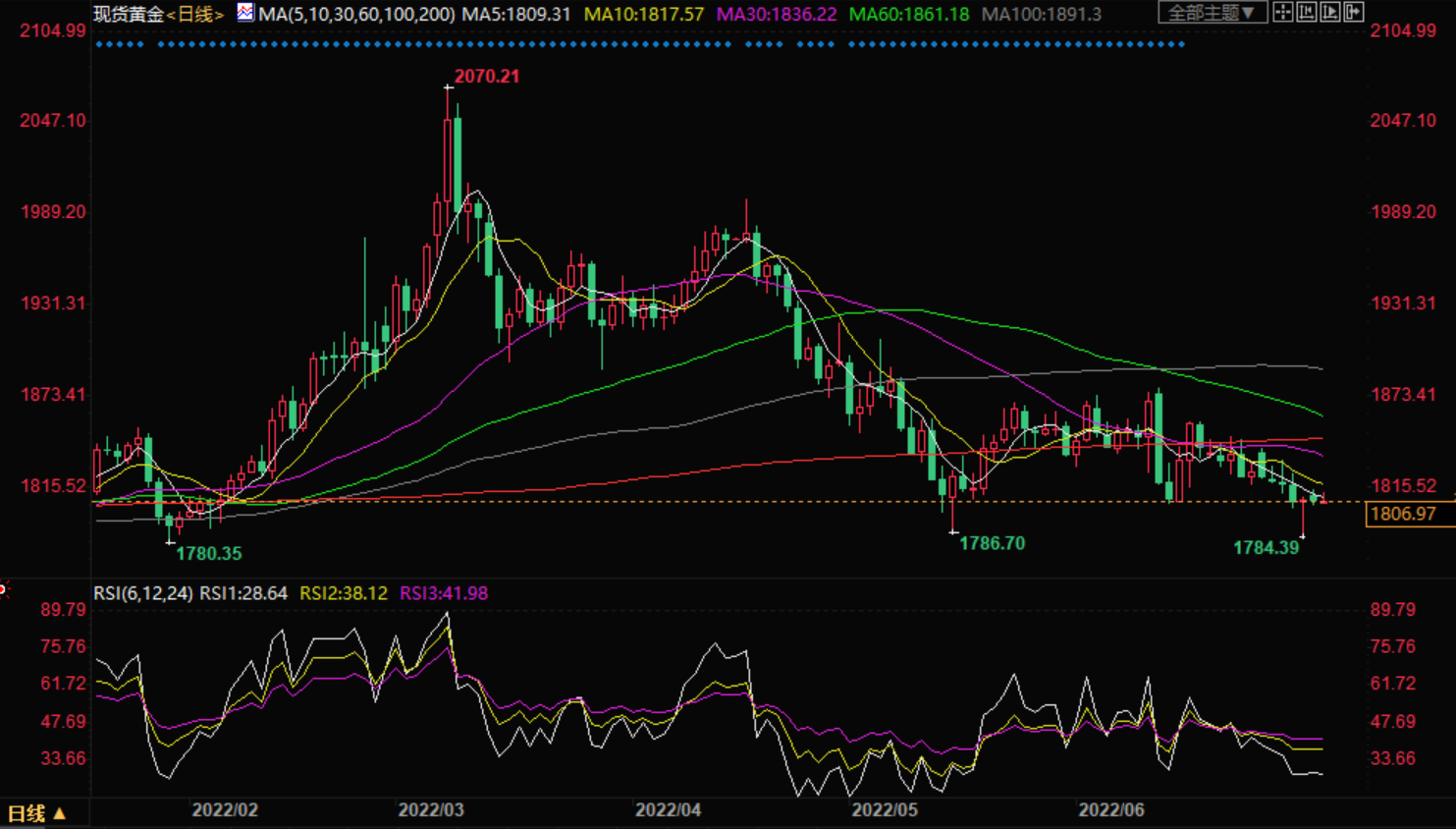 WTI原油价格以每小时为单位形成了复杂的双底,因此有可能在抛售之后出现逆转。上半年全球石油库存整体处于历史低位,但近期高频库存数据出现拐头迹象,在俄罗斯供给减量可能不及预期,以及石油消费面临压力的背景下,下半年原油供需平衡表存在转弱预期。在确认上涨趋势即将到来之前,油价还需要在每桶116美元的关口测试领口。随机正指向下方,表明熊市压力正在发挥作用。在达到超卖区域(反映出卖家的疲态)之前,该指标还有下滑空间,因此原油价格可能会继续跟进。