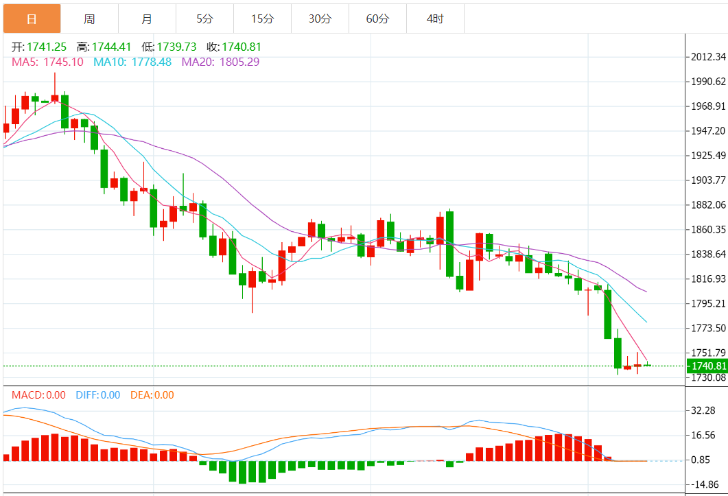 日图显示,金价在主要均线下方交易,且各均线保持下行势头,随机指标企稳于超卖区。4小时图显示,金价在10周期均线附近交易,仍远低于20、100和200周期均线,各均线保持下行势头,随机指标走低。小时图显示,金价在持平的10和20小时均线附近交易,但低于100和200小时均线,随机指标走高。日内建议逢高卖出,在1744附近卖出,反弹至1748附近加仓,止损位设于1752附近。