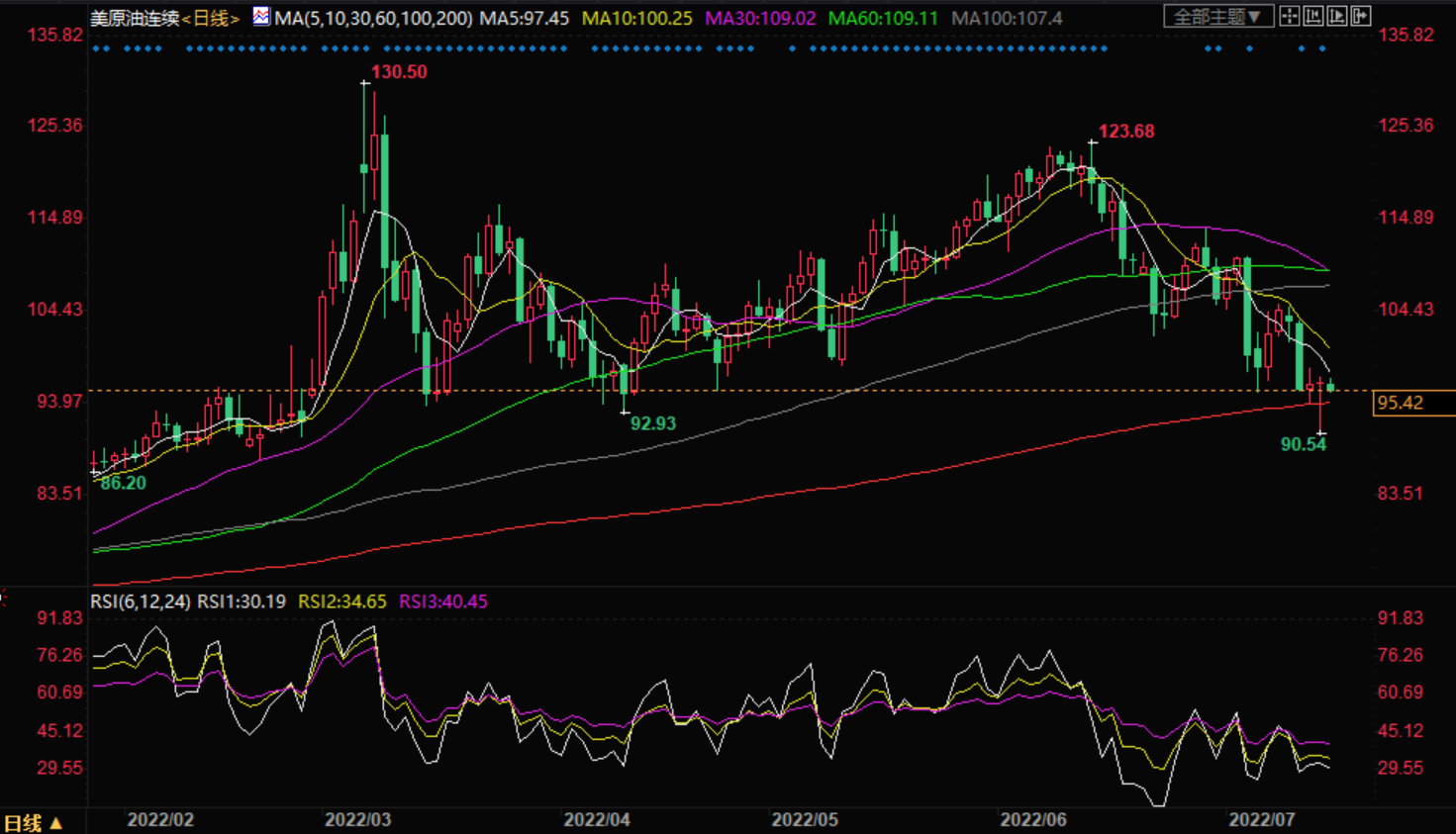 美原油震荡下跌,目前交投于95.30美元/桶附近,持续上涨的强势美元、对全球经济衰退的担忧、对需求前景的悲观预期,依然令油价承压,但供给面也传来了一些利好消息,一方面俄罗斯警告称G7的油价上限计划可能导致价格更高,另一方面市场预计美国总统拜登的中东之行很难令产油国实质性增加产量,供给紧张的前景吸引逢低买盘支撑油价;短线油价偏向低位震荡,酌情留意震荡筑底的可能性。