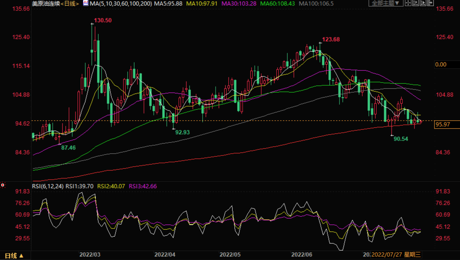 原油价格昨日继续看涨,但在收盘时下跌。原油价格收盘接近95.25美元,并可能继续维持在附近,直到明天凌晨联邦公开市场委员会宣布,交易员将观察利率宣布后的反应。目前,原油价格区间介于95.25美元至106.00美元之间。突破并在区间外收盘将确认下一个方向。