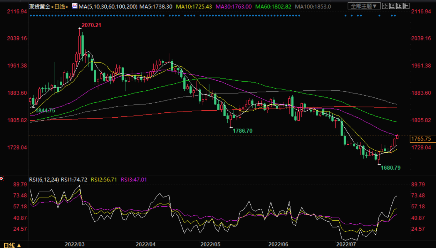 WTI油价近期跌幅收窄处在96.50美元附近。在这期间,继前日反弹遇阻后,WTI油价试图跌破三周对称三角形形态。同样令多头维持预期的是WTI油价维持处在6 月14 日以来下降趋势线上方,且MACD信号看涨且相对强弱指标(14)更为走强。WTI油价仍需日线收盘突破98.00 美元(上述三角形上沿和21 日均线汇合处),多头才能占主导。