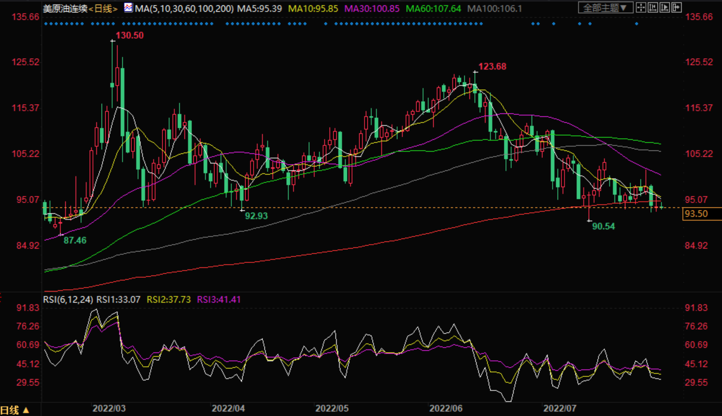 美原油窄幅震荡,目前交投于93.86美元/桶附近,市场对OPEC+增加产量的预期降温,给油价提供支撑,但全球经济前景不佳,全球股市普遍下跌,而且API原油库存意外增加,拖累油价表现。目前市场存在一些观望情绪,投资者等待OPEC+会议的具体消息,但技术面略微偏向空头,需要提防破位大跌风险。