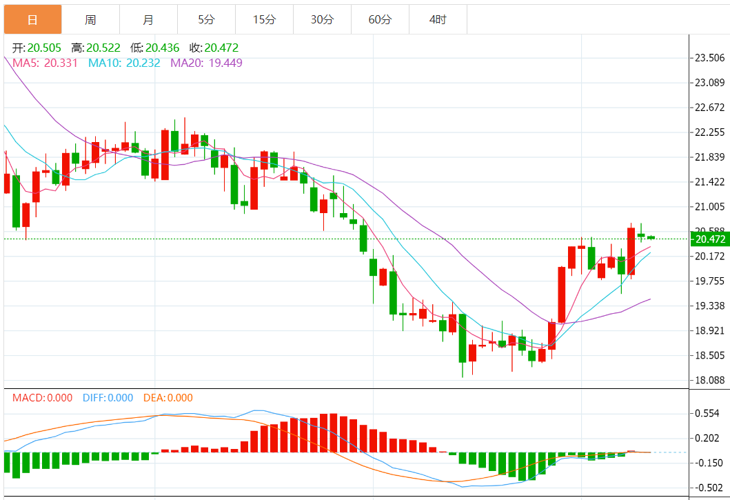 日图在大阳线后小幅回调,随机指标熊背离。4小时图回踩20.50前期阻力转化的支持,短线仍倾向进一步回调。小时图温和走低,或指向20.20一线支持。日内建议谨慎操作,激进者寻求20.55下方做空,止损20.70,下看20.20。