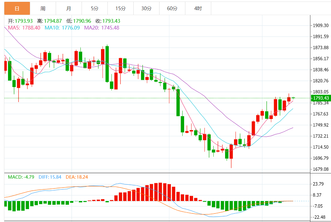 日图继续小幅上涨刷新高点,但随机指标熊背离,信号不一,暂时看反弹高位震荡。4小时图进一步扩大涨幅,短线反弹势头维持完好。小时图测试1800一线略显遇阻,但回调动能不强。日内建议谨慎操作,激进者寻求1795下方轻仓做空,紧设止损,先看1785。