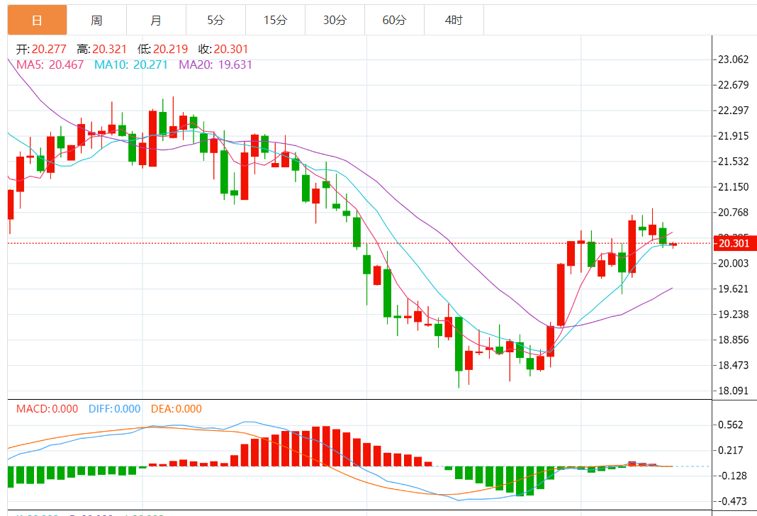 周五亚洲市场,白银价格仍在20.30美元/盎司附近承压,延续上一交易日的看跌倾向。从白银日线图来看,在近期MACD指标看涨信号减弱的情况下,银价守住6-7月跌势的50%斐波那契回撤位。