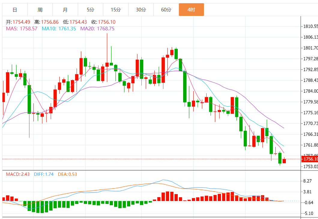 从黄金4小时图来看,金价在一周以来下降楔形的支撑线附近继续承压。假如金价跌破1754美元/盎司支撑位,金价可能进一步下滑,随后200周期简单移动平均线(SMA)1750美元/盎司可能对黄金空头构成挑战。值得注意的是,相对强弱指标(RSI)近乎呈现超卖状态,这可能限制金价进一步的跌势。